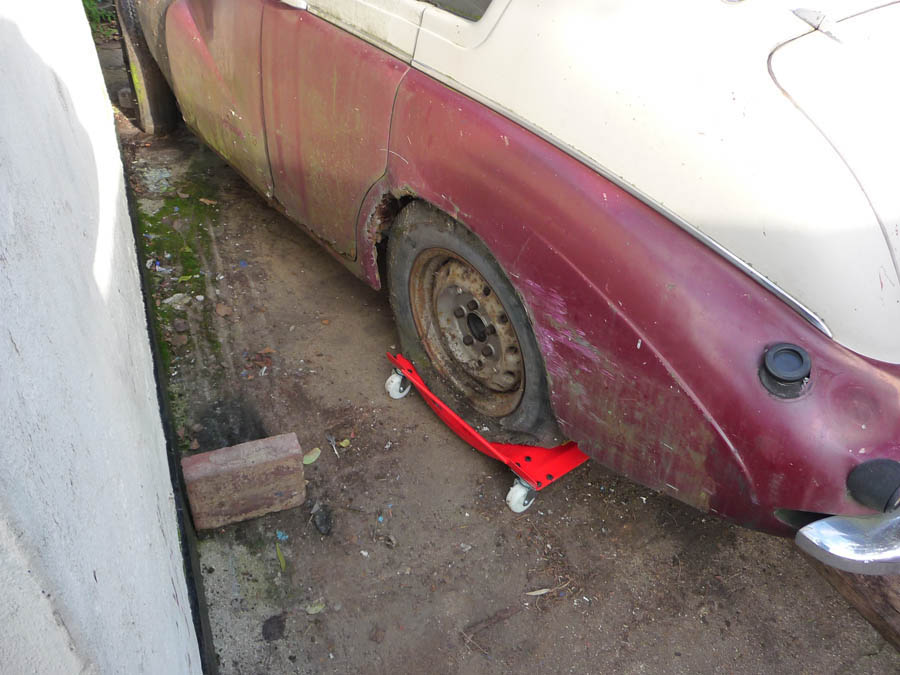 The answer... Dollies! A quick bit of internet ordering later and we had a pair of dollies which were perfect. The jacking up of the car was a little tricky as no matter what we did, we just couldn't get her high enough. You see we only had one of those £20 baby trolley jacks available, but with a little ingenuity (and quite a few bricks) we got the dollies under the tyres and with minimal effort she slid majestically side ways giving as much room as we needed.