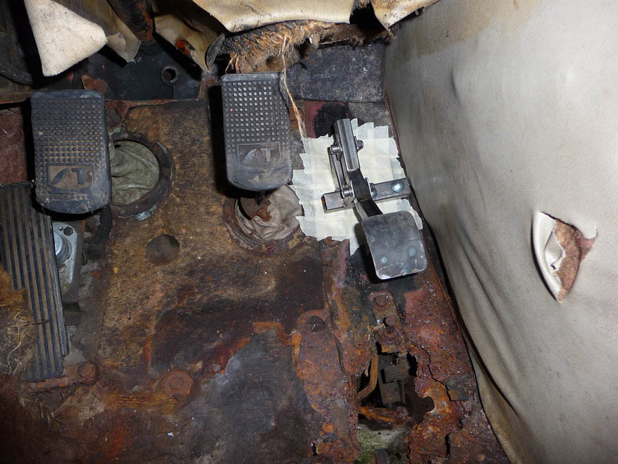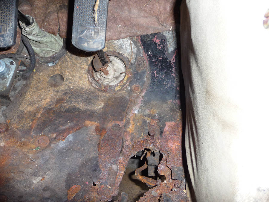 With the engine now running we were filled with encouragement, however when I was inside the car getter her started I noticed that the throttle pedal was flat on the floor. I didn't think much of it at the time as I assumed the cable had become stuck. One closer inspection I found not only had the pedal become totally detached but on lifting the remnants of the carpet I was greeted by a medium sized rusty hole where the throttle had once been.