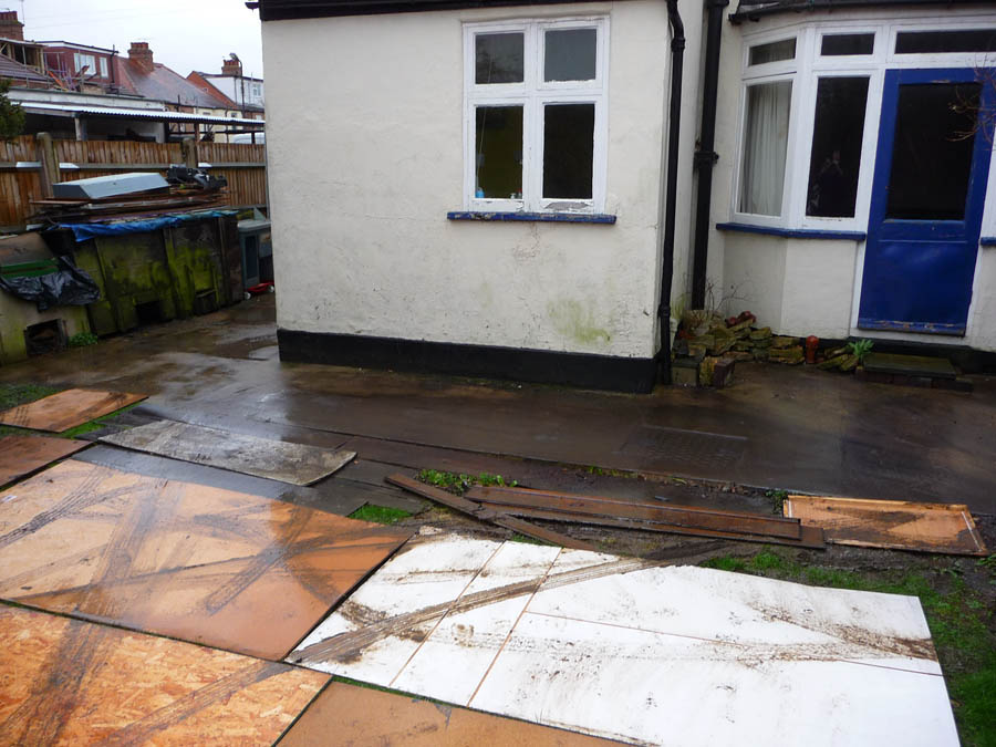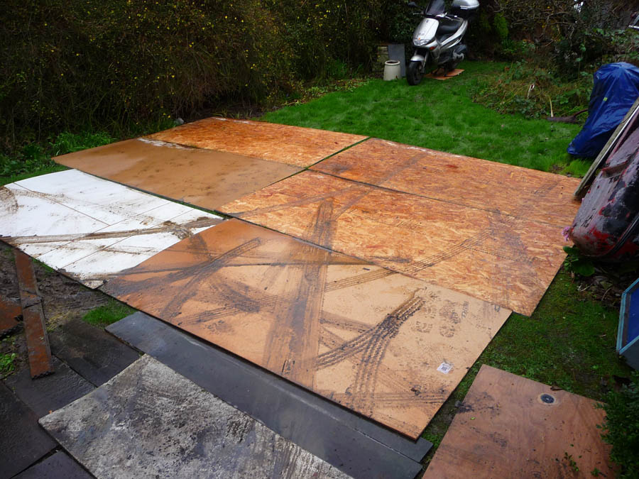 Whilst we were getting the various "give here a fair chance" jobs done we were also clearing the garage ready for 'the big move'. Even though it was raining, this was the weekend we'd been waiting for to see if our efforts were in vain. Luckily the garage clear out had provided various 8'x 4' sheets with which we used to protect the lawn from the bog it would soon turn into.