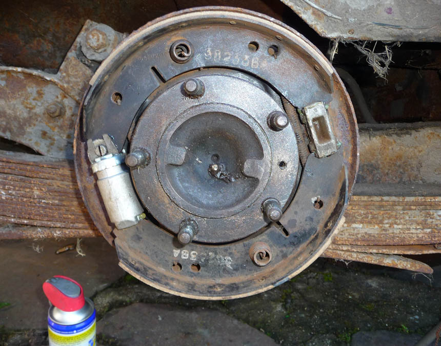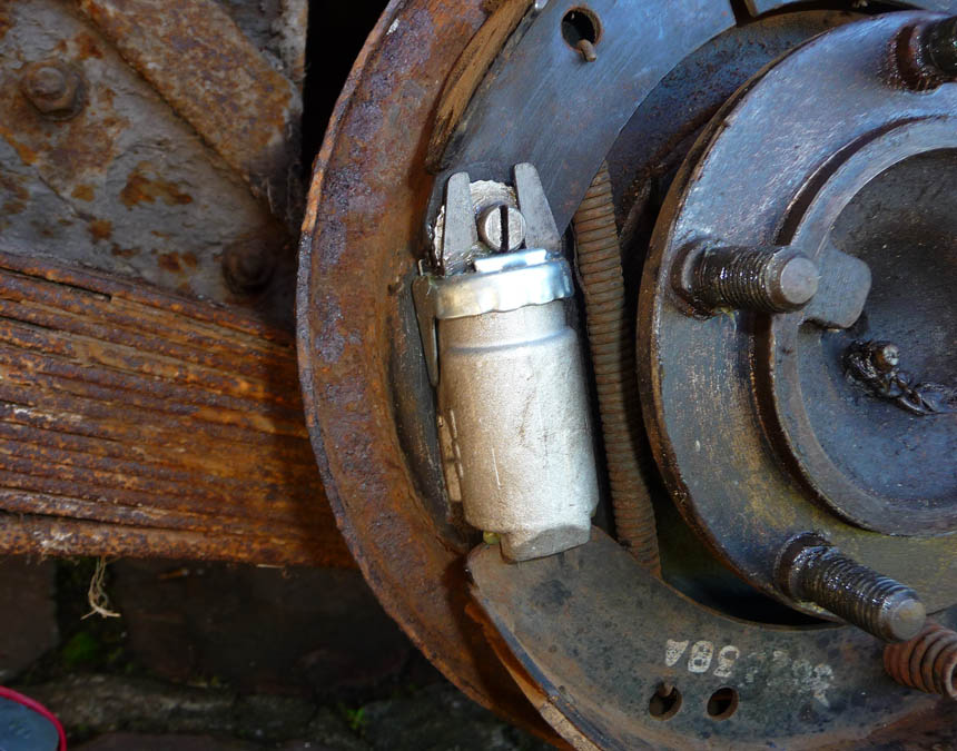 With the rear wheel cylinders removed you can see the extent of the crust. Not worth a refurbishment this time.